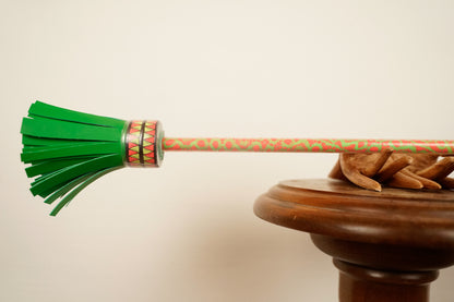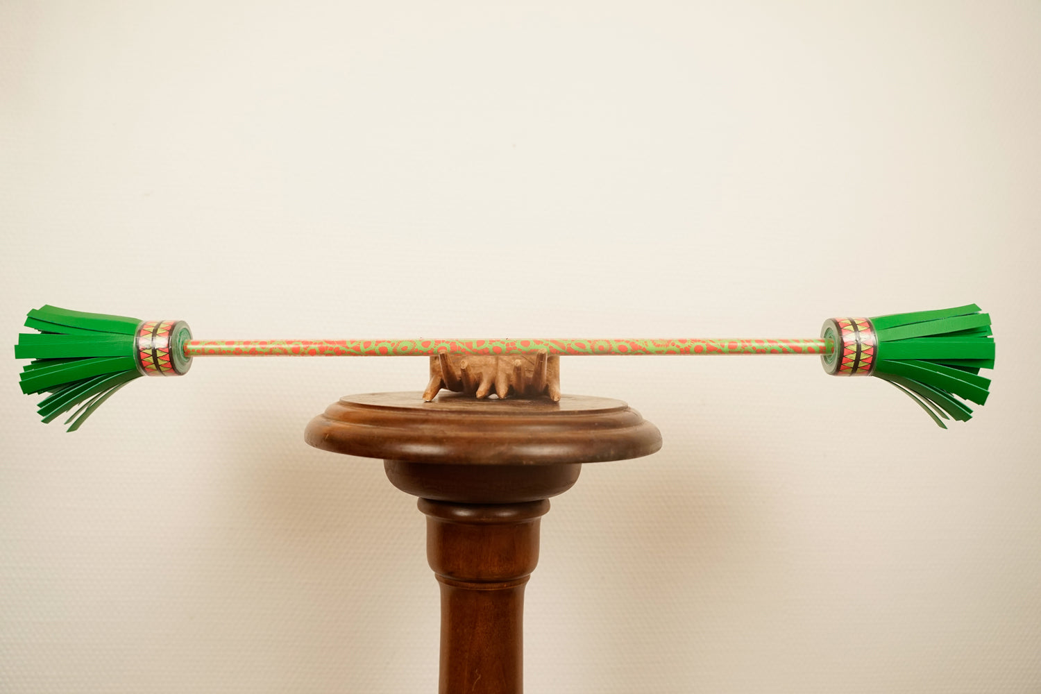 All sticks are painted in several layers of varnish, some with very elaborately glued and sewn patterns.