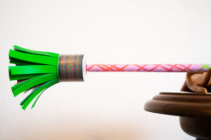 Alle Sticks sind in mehreren Lack-Schichten, mit in teils sehr aufwendig geklebten und genähten Mustern lackiert.
