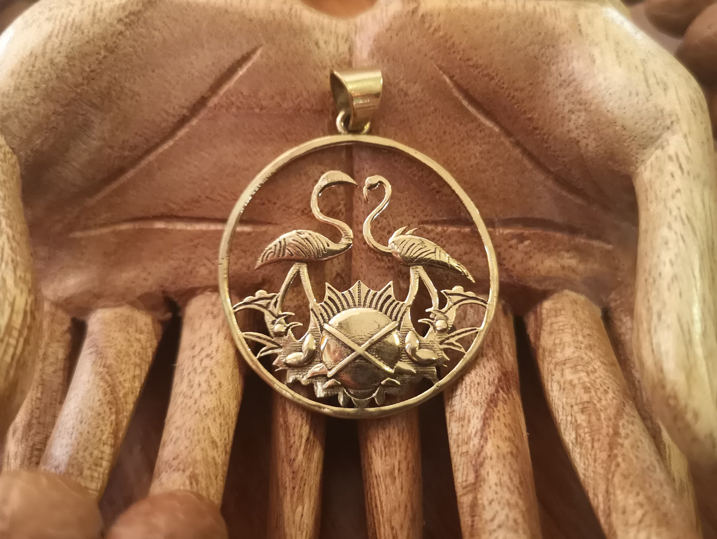 Diese Kette zeigt in unseren Augen zwei verliebte Flamingos, die vogelfrei durch die Welt spazieren.