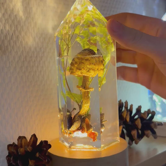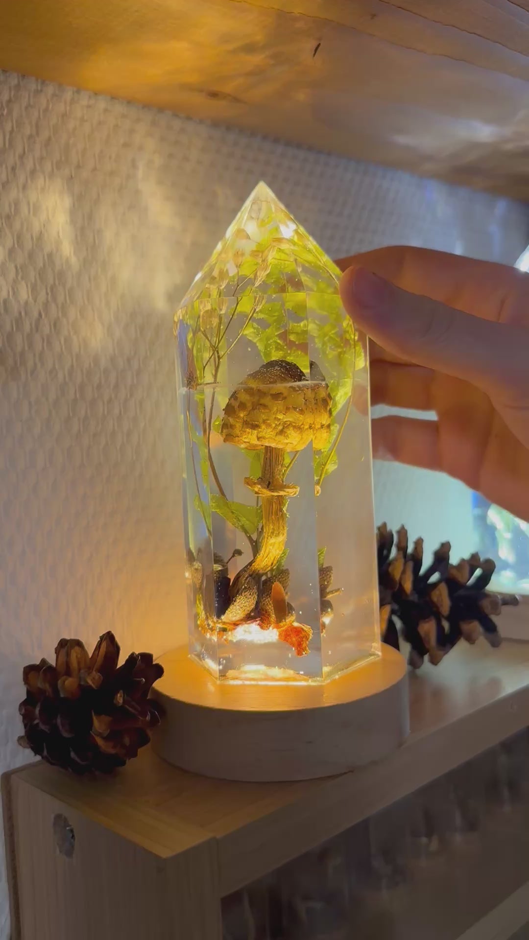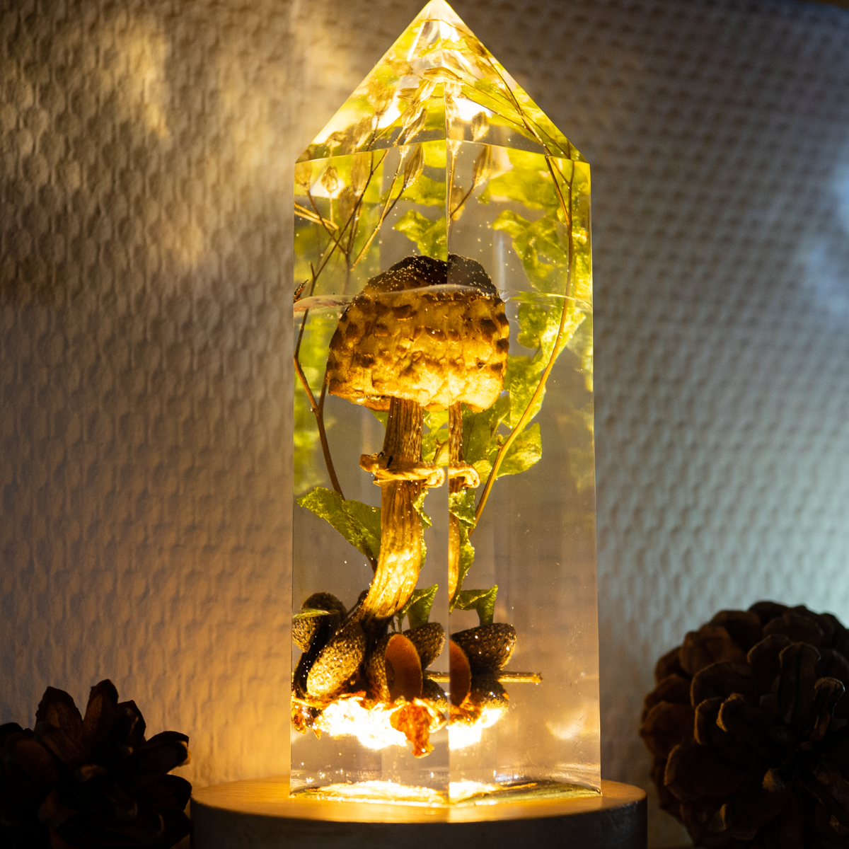 Je nach Licht verändert sich der Charakter des Objekts: Im Tageslicht wirkt es ruhig und fast botanisch, im warmweißen Licht beginnt der Kristall von innen zu leuchten und verleiht den Pilzen eine goldene Tiefe. Bei neutralem Weißlicht treten Form und Detail in den Vordergrund.