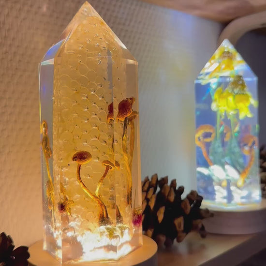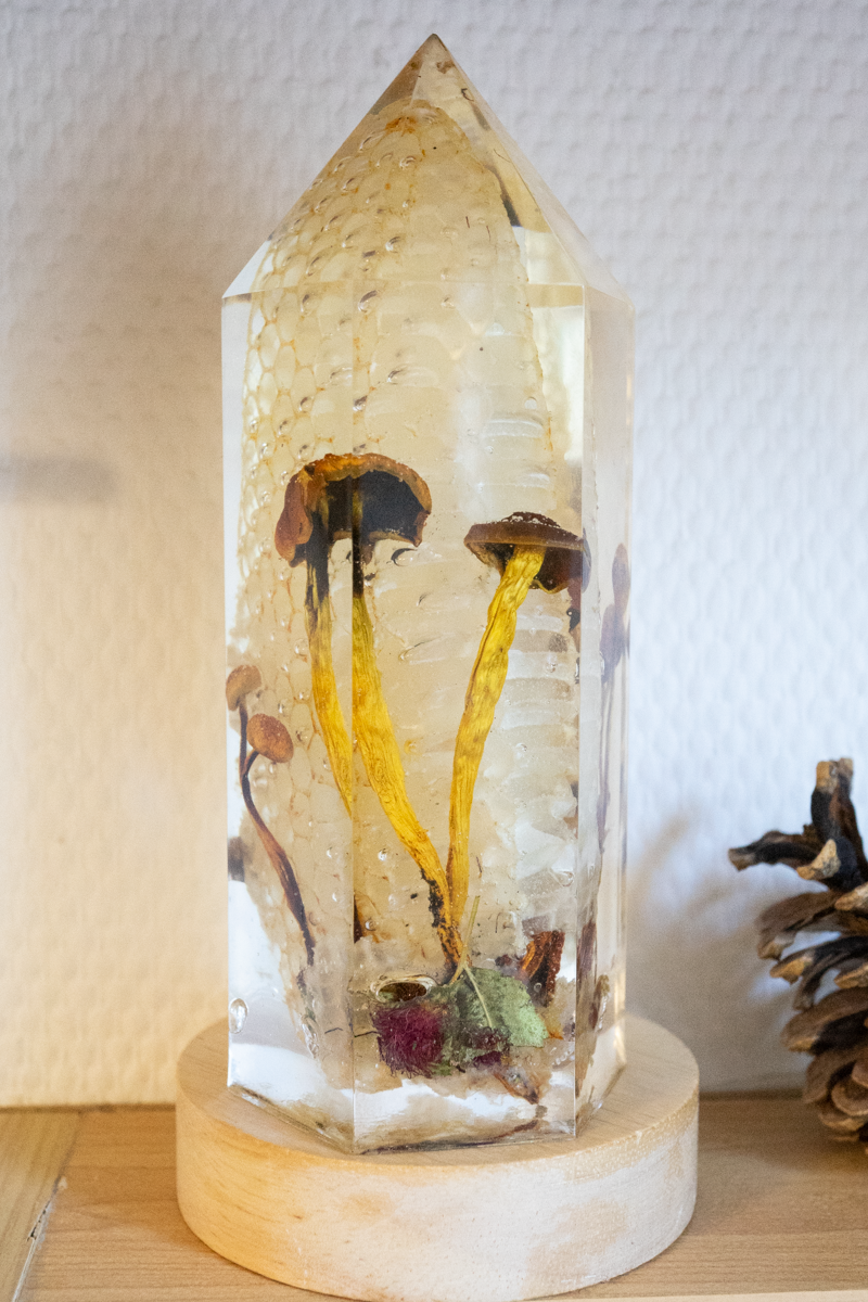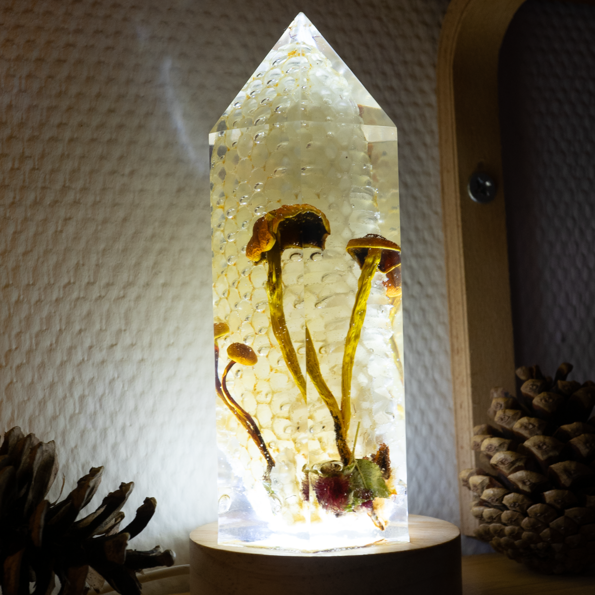 Je nach Licht verändert sich der Charakter des Objekts: Im Tageslicht wirkt es ruhig und fast botanisch, im warmweißen Licht beginnt der Kristall von innen zu leuchten und verleiht den Pilzen eine goldene Tiefe. Bei neutralem Weißlicht treten Form und Detail in den Vordergrund.