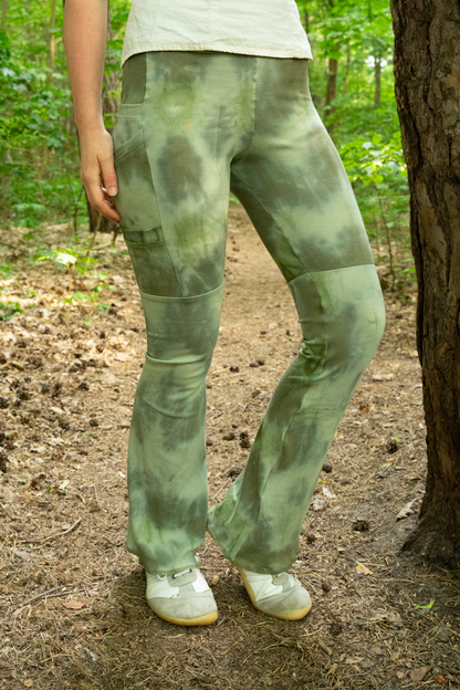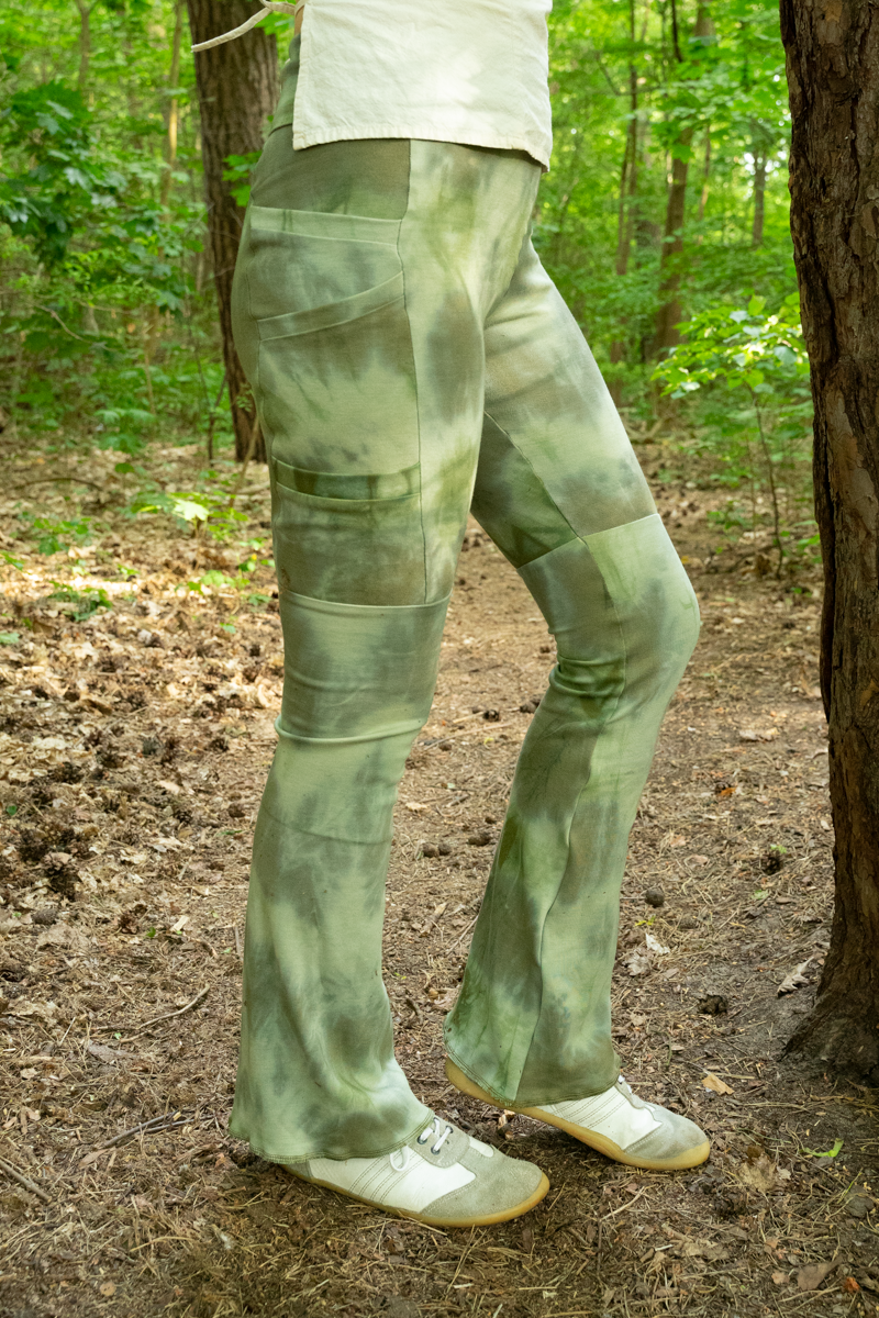 Hose im Leggings-Stil mit weitem Beinabschluss und bequemer Passform in Größe S (36). Das elastische Bündchen kann auch umgeschlagen getragen werden. Mit insgesamt sechs Taschen bietet die Hose praktischen Stauraum. Der handgebatikte Stoff macht jedes Exemplar zu einem Unikat. Die Schrittlänge ist auf Wunsch anpassbar.