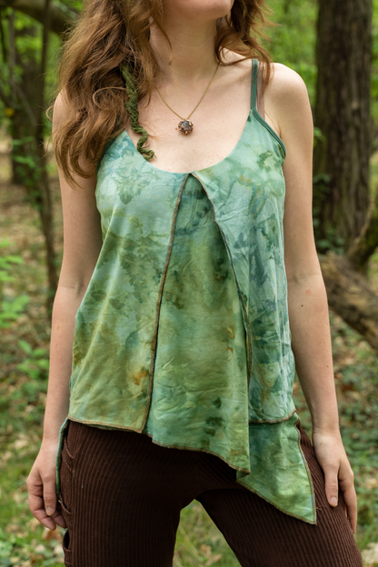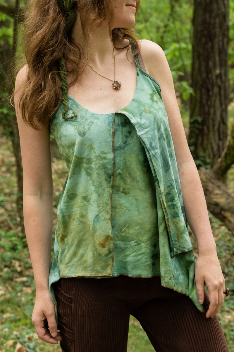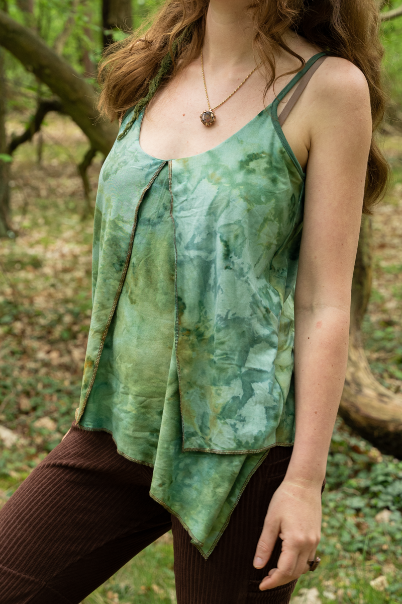 Top in Größe M (38) aus besonders weichem Bambusjersey. Der Schnitt ist körpernah, dabei bequem und so gestaltet, dass es auch ohne BH getragen werden kann. Das Design ist von Blattformen inspiriert, der Stoff handgebatikt und angenehm kühl auf der Haut – ideal für warme Tage.