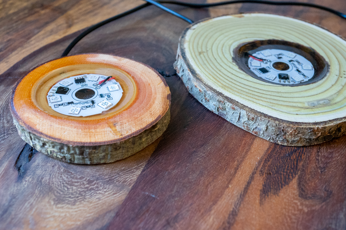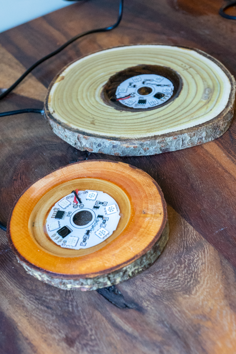 Das Holz des Essigbaums reagiert unter UV-Licht und verändert subtil seine Erscheinung. In Kombination mit der integrierten Farbwechslerlampe entsteht ein lebendiges Zusammenspiel aus Farbe, Reflexion und Materialtiefe.