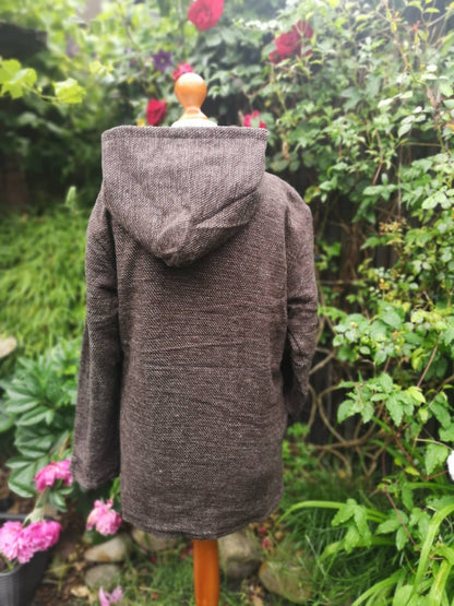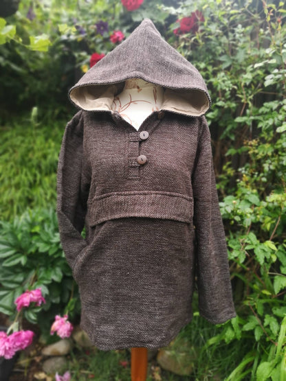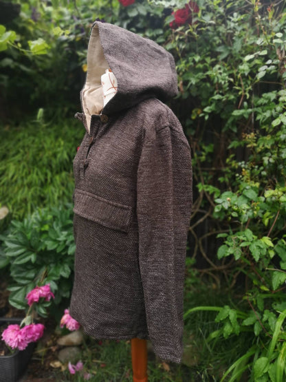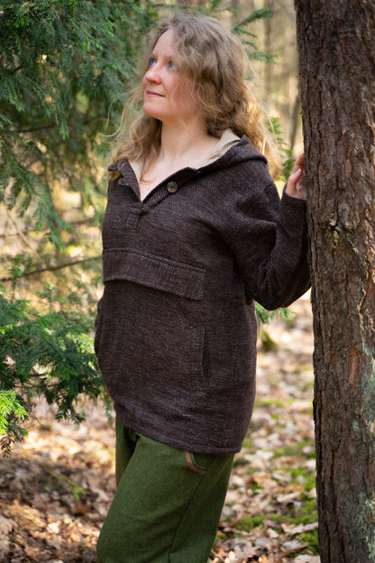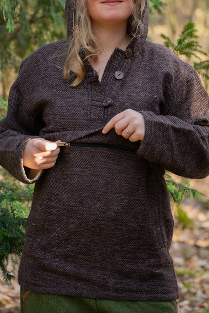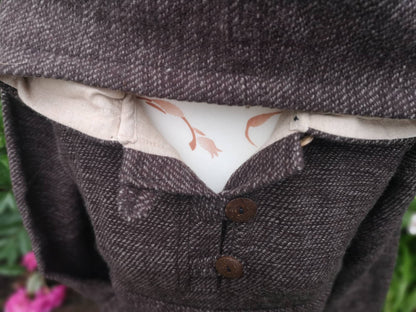 Das Material ist ein melierter Wollstoff in braun/beige.